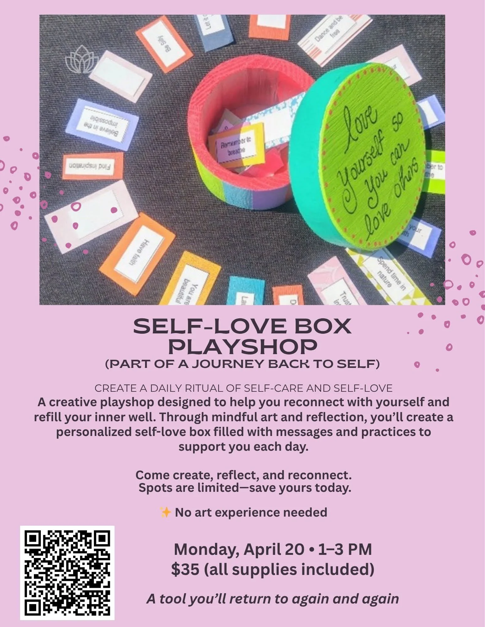 In this playshop we will create a self love box filled with personalized messages that provides a tangible tool for self-care that you can return to over and over again.